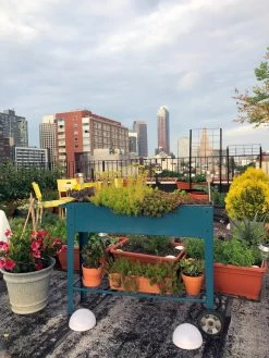 Planted with flowers, vegetables or herbs, this mobile cart is a beautiful addition to your porch, patio or balcony. The planter box sits at a comfortable working height, making it easy to tend. And your plants are out of reach of animal pests, too. With large, 5-3/4″ diameter wheels and a sturdy handle, you can easily roll it on your deck or patio to keep plants in the sun or to move it out of the way. The cart is made from sturdy yet lightweight, powder-coated steel in rich hues to complement your landscape and showcase plants. A handy shelf holds accessories.